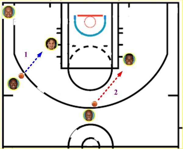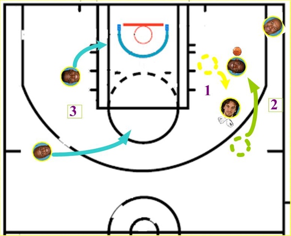 Gasol上來做一個單擋後,迅速執行切入或急停跳投。