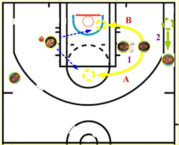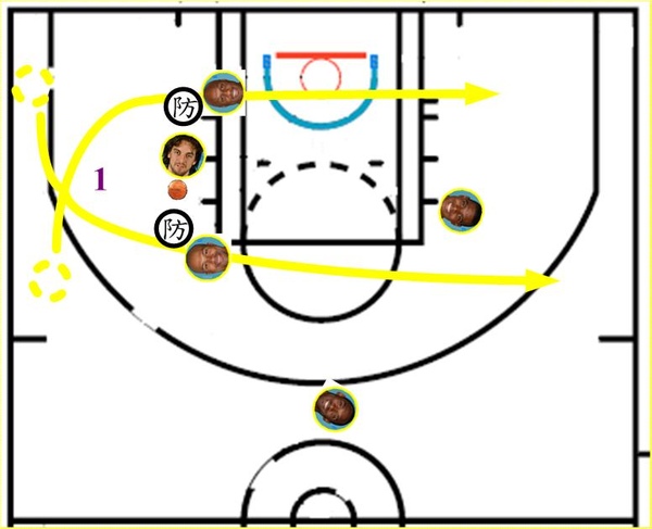 以下是在三角戰術2-men game中,最常見的擋切(pick & roll)配合,已